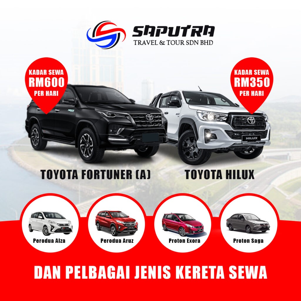 Saputra Travel & Tours Sebuah agensi pelancongan yang terlibat dalam bidang sewa kereta dan industri perniagaan pelancongan sejak tahun 2015. Kami menyediakan perkhidmatan sewa kereta, lawatan masuk, lawatan persiaran tempatan, homestay, resort dan hotel.